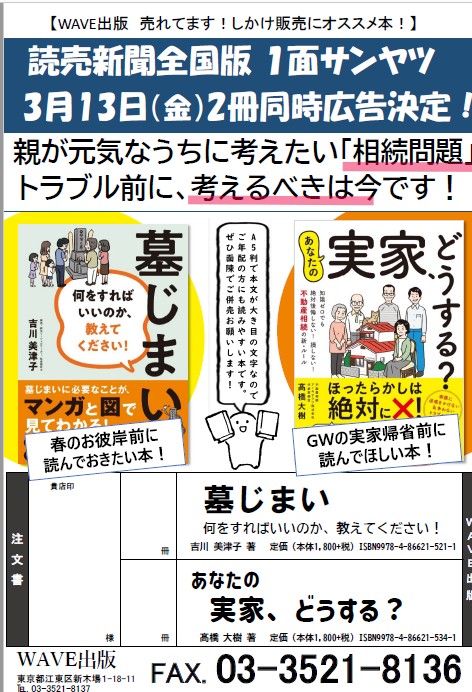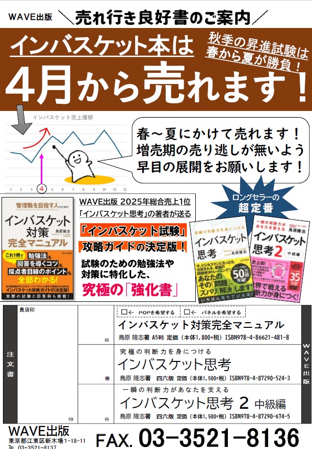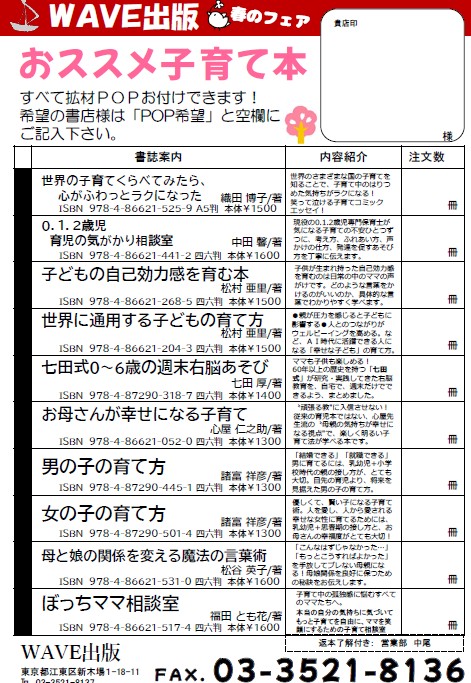 お問い合わせ先:営業部 営業時間:平日9:00~17:00 電話番号:03-3521-8137 FAX:03-3521-8136 メールアドレス:order@wave-publishers.co.jp
